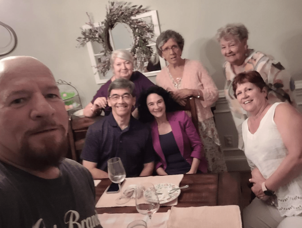 I cropped the photo some but had to leave the umbrella in, proof that spring warmth is allowing some outside dining. Left to right are Leslie and Chris Moellering, Maria Smoak, Alison and Wes Levitt, and Steve Andersen, hostess Bobbie Culbertson Andersen serving as photographer. Steve and Bobbie filled in for Lora Shortt who was unable to participate due to illness of her mother in West Virginia.